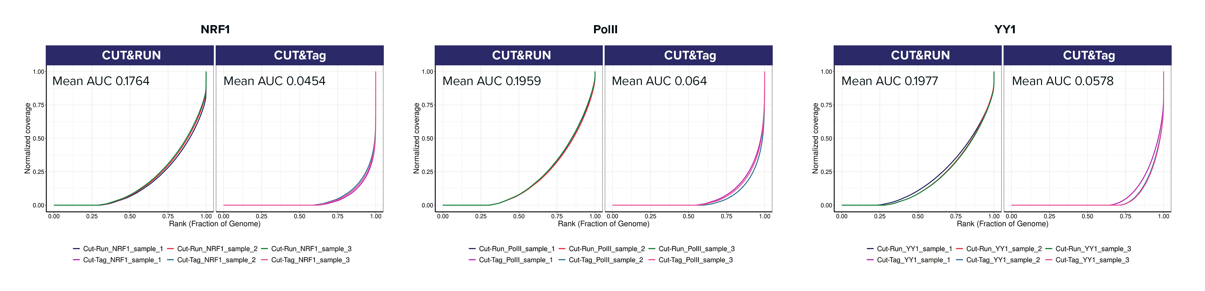 Figure 4. Fingerplot analysis comparing CUT&Tag and CUT&RUN enrichment for three targets (YY1, RNA Polymerase II, and NRF1). Fingerplots display the cumulative fraction of reads ranked by signal intensity, providing a measure of enrichment. The Area Under the Curve (AUC) reflects the overall distribution: lower AUC indicates stronger enrichment, as reads are concentrated in fewer, high-signal regions. CUT&Tag consistently shows lower AUC values compared to CUT&RUN.
